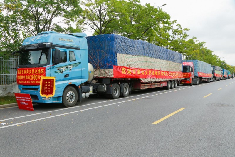 仪式结束后,5辆满载爱心的货车鸣笛启程,带着国货品牌的初心与担当,向着欠发达地区疾驰而去。